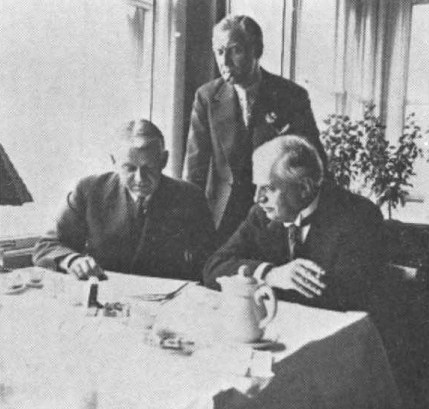 Fra mødet 1937 ser vi længst til venstre Munksgaard, i midten Nilsonne stående og til højre Patrik Haglund. Det må have drejet sig om Acta orthopaedica spørgsmål.